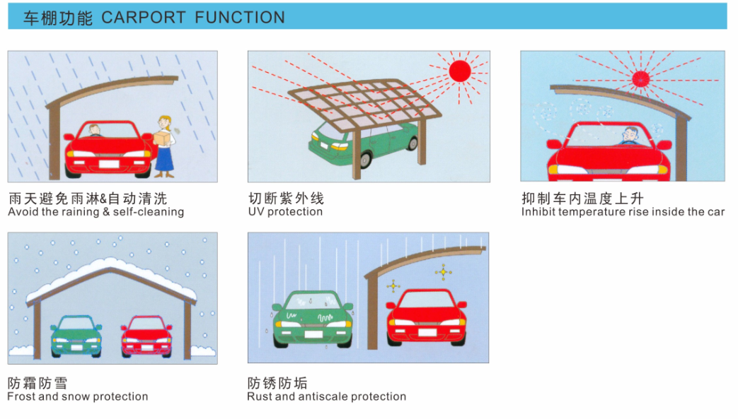 本車棚采用的聚碳酸酯板材含有光觸媒,自身具備利用自然光及雨水自動清洗灰塵的能力,保持頂部清潔亮麗。